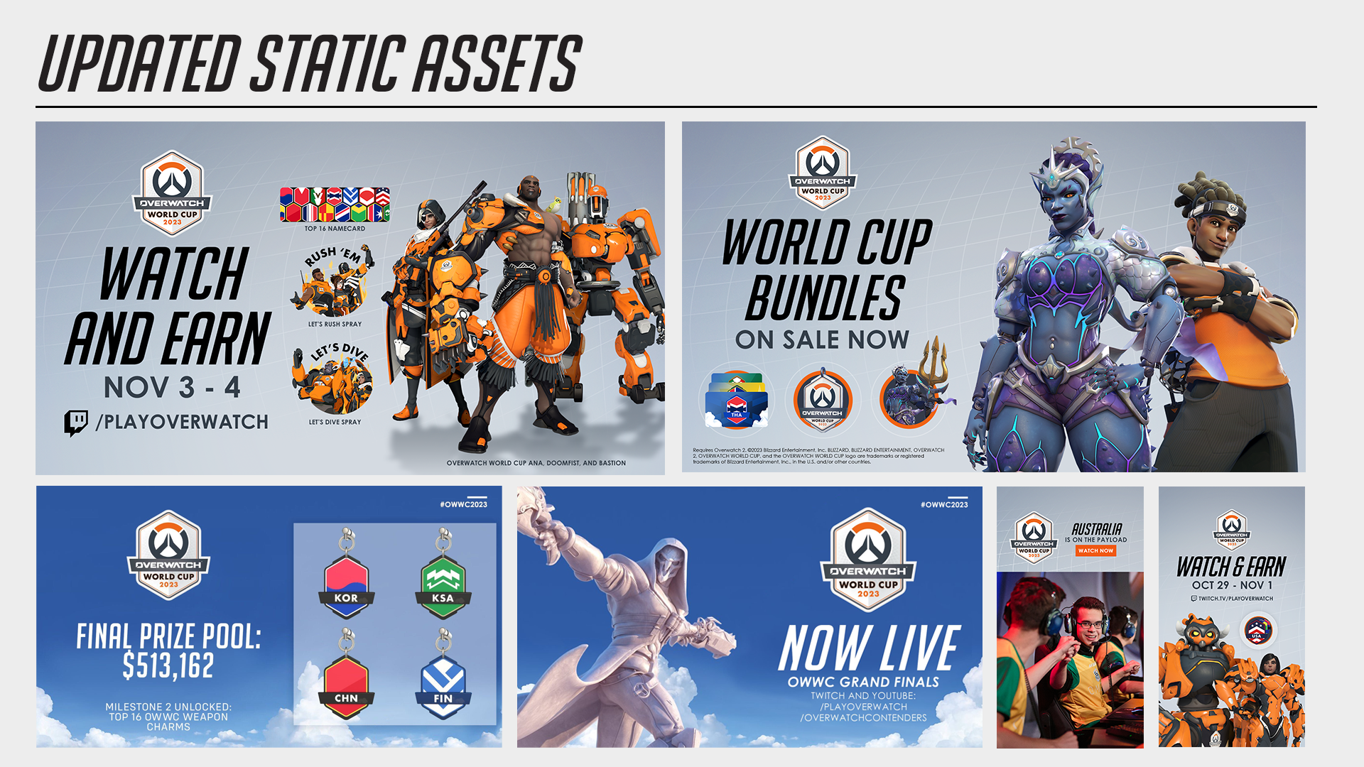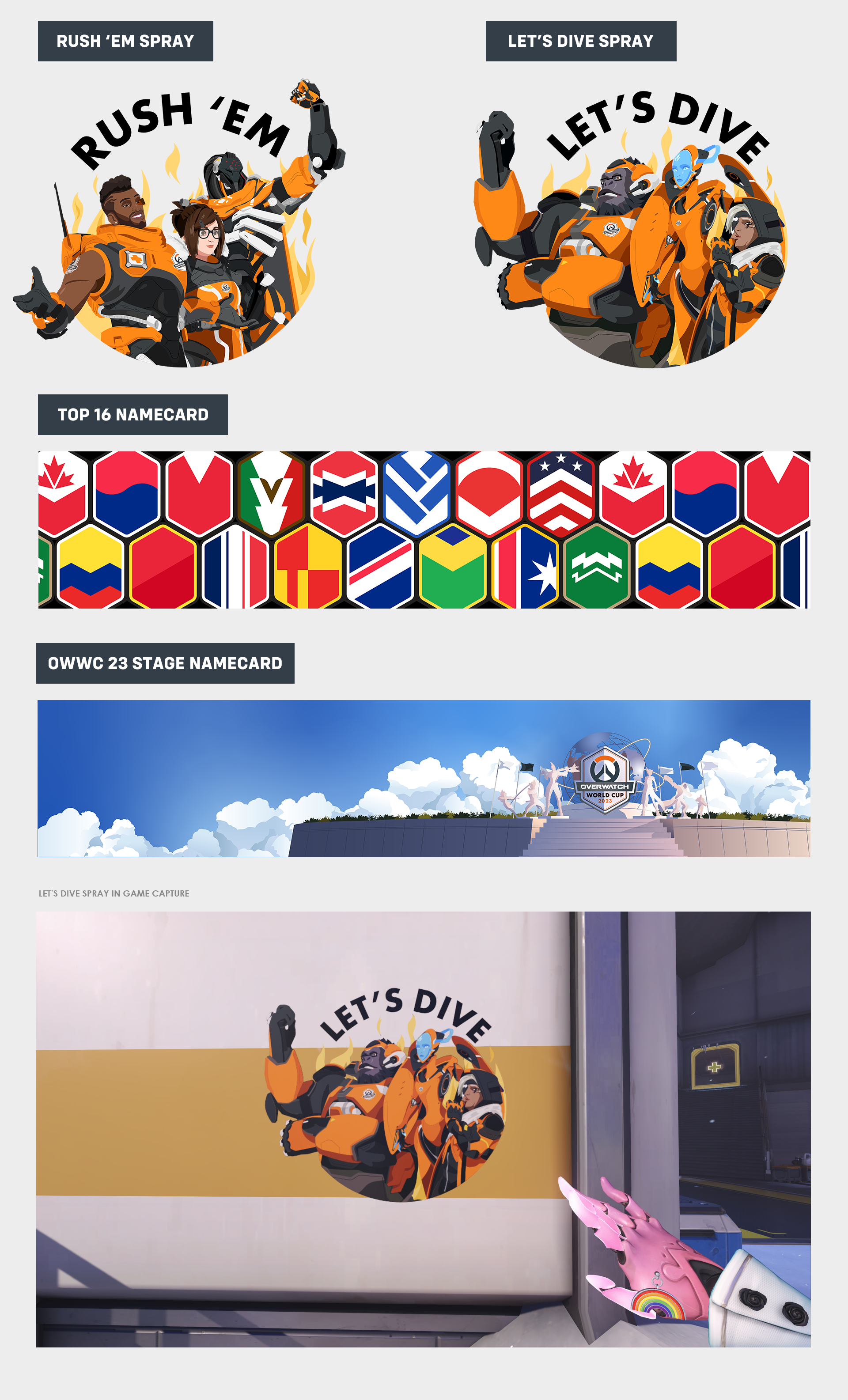 I was also tasked to illustrate viewership incentives for streaming the Overwatch World Cup on Youtube/Twitch. I wanted to commemorate the different “compositions” that were popular during the 2023 World Cup in the sprays. The name cards highlight our top 16 teams and is a spin on the infamous World Cup stage with new characters like Junkerqueen and Kiriko.