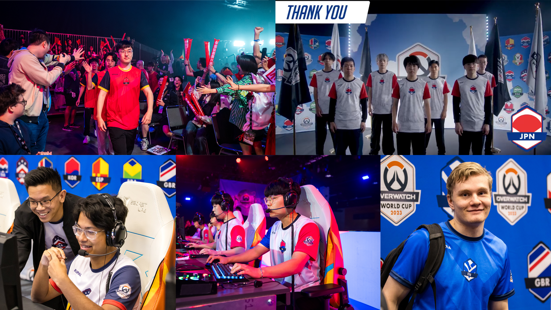 Players and staff rocking the custom jerseys for OWWC and at BlizzCon 2023.
