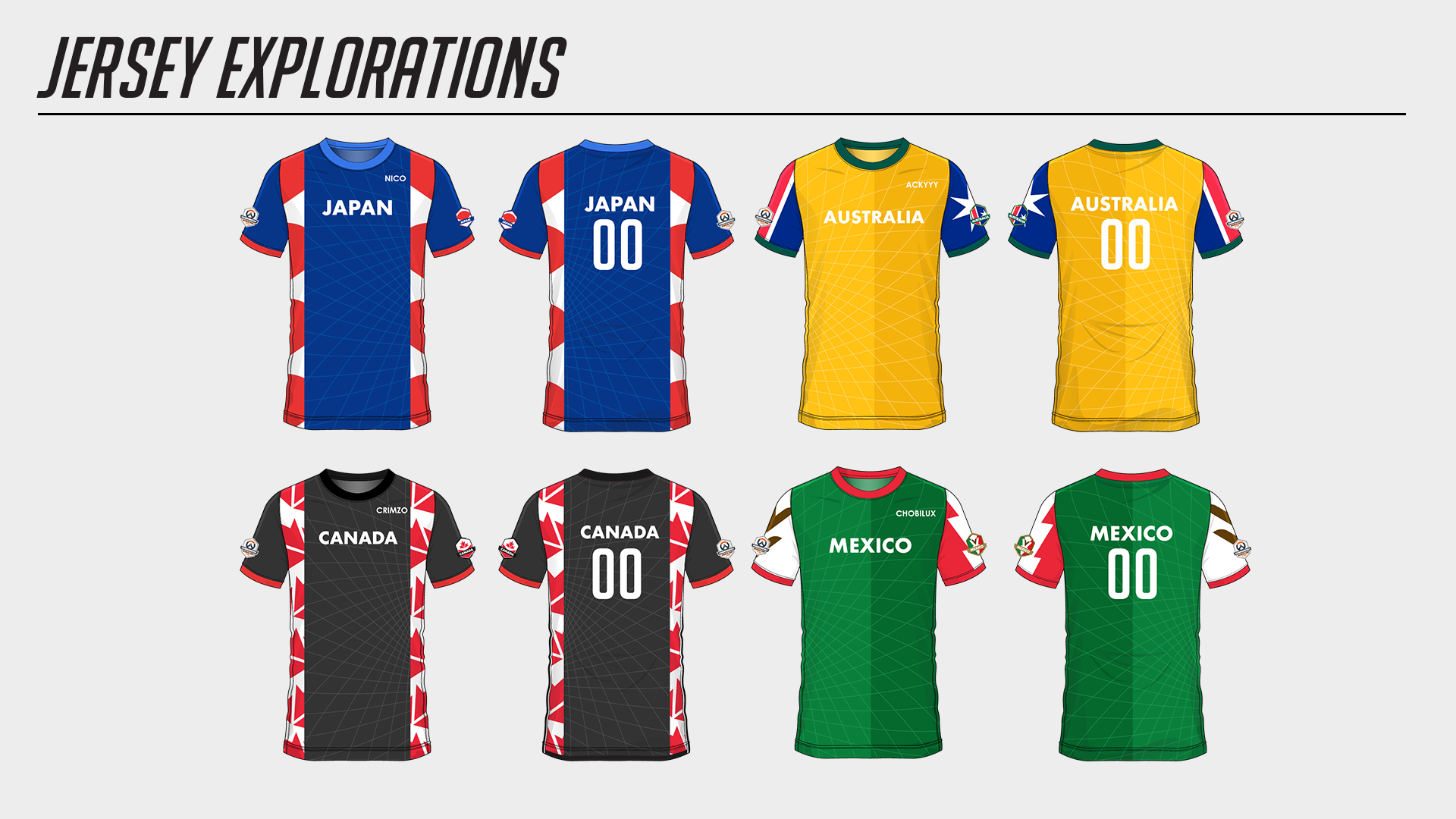 With an international competition, it was important that each participating country/region would be appropriately represented. We were tasked to to reinterpret country/region flags into logos: using abstraction, maintaining respect for the countries’ flags, and adhering to legal feedback. Below you’ll find our inspiration and some progress images as this went through rounds of back and forth with feedback.